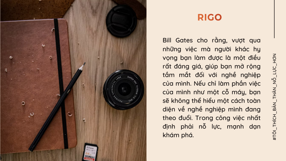 Bill Gates cho rằng, vượt qua những việc mà người khác hy vọng bạn làm được là một điều rất đáng giá, giúp bạn mở rộng tầm mắt đối với nghề nghiệp của mình. Nếu chỉ làm phần việc của mình như một cỗ máy, bạn sẽ không thể hiểu một cách toàn diện về nghề nghiệp mình đang theo đuổi. Trong công việc nhất định phải nỗ lực, mạnh dạn khám phá.