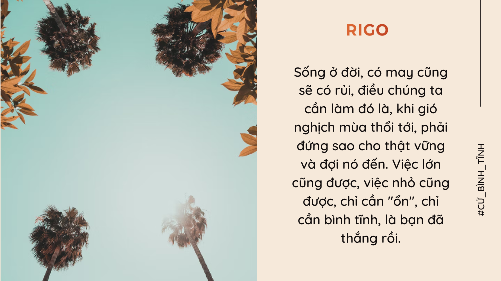 Sống ở đời, có may cũng sẽ có rủi, điều chúng ta cần làm đó là, khi gió nghịch mùa thổi tới, phải đứng sao cho thật vững và đợi nó đến. Việc lớn cũng được, việc nhỏ cũng được, chỉ cần “ổn”, chỉ cần bình tĩnh, là bạn đã thắng rồi.