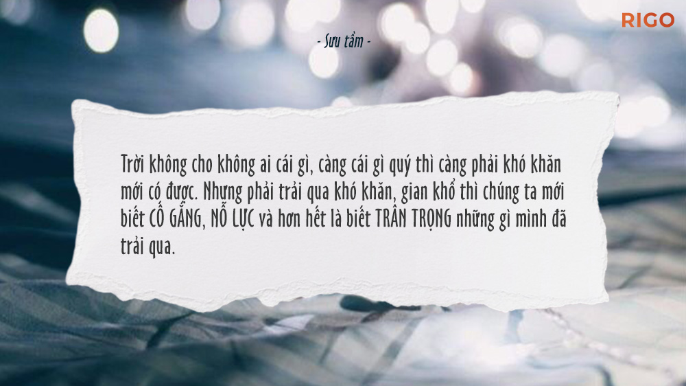 Trời không cho không ai cái gì, càng cái gì quý thì càng phải khó khăn mới có được. Nhưng phải trải qua khó khăn, gian khổ thì chúng ta mới biết cố gắng, nỗ lực và hơn hết là biết trân trọng những gì mình đã trải qua.