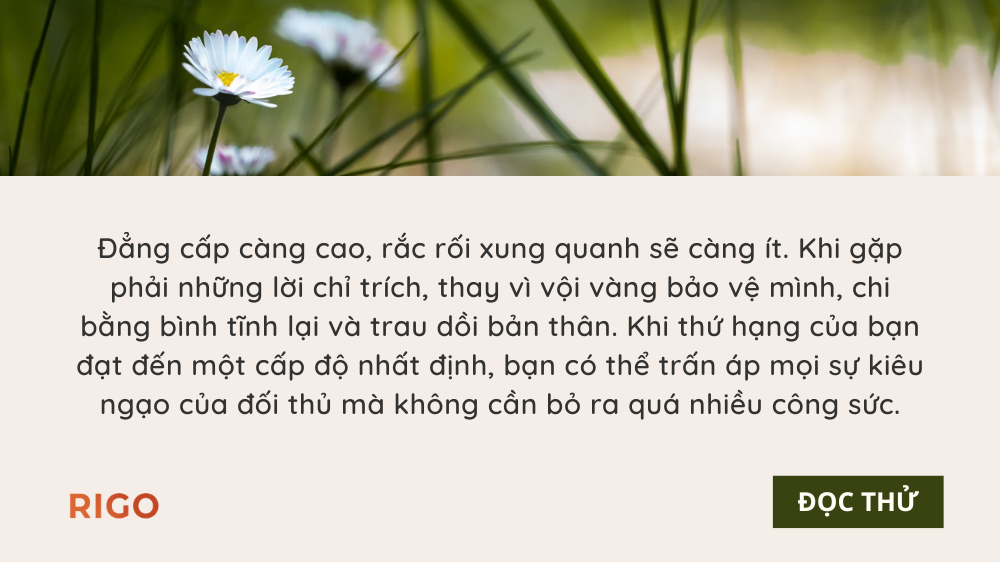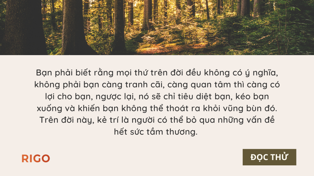 Bạn phải biết rằng mọi thứ trên đời đều không có ý nghĩa, không phải bạn càng tranh cãi, càng quan tâm thì càng có lợi cho bạn, ngược lại, nó sẽ chỉ tiêu diệt bạn, kéo bạn xuống và khiến bạn không thể thoát ra khỏi vũng bùn đó. Trên đời này, kẻ trí là người có thể bỏ qua những vấn đề hết sức tầm thương.