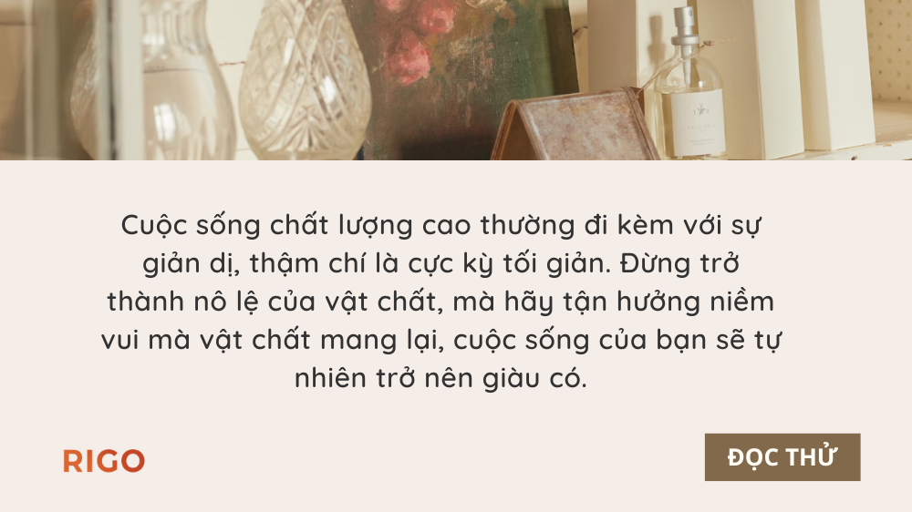 Tagore từng nói: “Có một đêm, tôi đã đốt cháy tất cả ký ức, từ đó giấc mơ chẳng còn rối ren; có một buổi sáng, tôi đã vứt bỏ tất cả những ngày hôm qua, từ đó bước chân trở nên nhẹ nhàng”. Cuộc sống chất lượng cao thường đi kèm với sự giản dị, thậm chí là cực kỳ tối giản. Đừng trở thành nô lệ của vật chất, mà hãy tận hưởng niềm vui mà vật chất mang lại, cuộc sống của bạn sẽ tự nhiên trở nên giàu có.