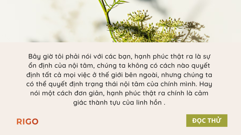 Bây giờ tôi phải nói với các bạn, hạnh phúc thật ra là sự ổn định của nội tâm, chúng ta không có cách nào quyết định tất cả mọi việc ở thế giới bên ngoài, nhưng chúng ta có thể quyết định trạng thái nội tâm của chính mình. Hay nói một cách đơn giản, hạnh phúc thật ra chính là cảm giác thành tựu của linh hồn .