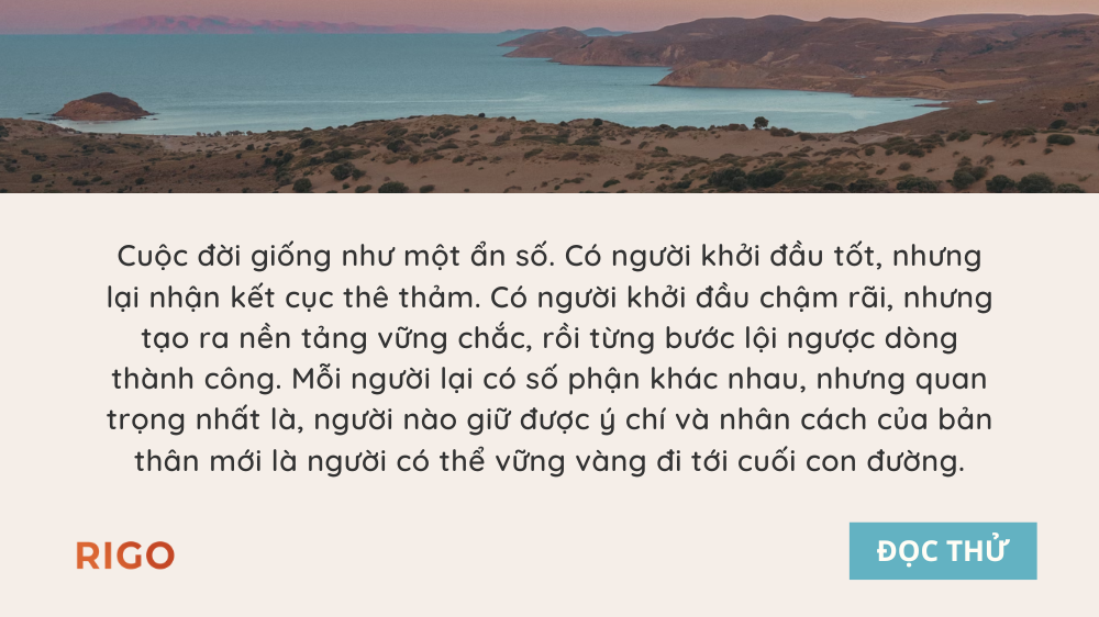 Cuộc đời giống như một ẩn số. Có người khởi đầu tốt, nhưng lại nhận kết cục thê thảm. Có người khởi đầu chậm rãi, nhưng tạo ra nền tảng vững chắc, rồi từng bước lội ngược dòng thành công. Mỗi người lại có số phận khác nhau, nhưng quan trọng nhất là, người nào giữ được ý chí và nhân cách của bản thân mới là người có thể vững vàng đi tới cuối con đường.