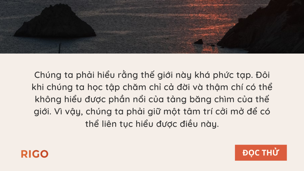 Chúng ta phải hiểu rằng thế giới này khá phức tạp. Đôi khi chúng ta học tập chăm chỉ cả đời và thậm chí có thể không hiểu được phần nổi của tảng băng chìm của thế giới. Vì vậy, chúng ta phải giữ một tâm trí cởi mở để có thể liên tục hiểu được điều này.