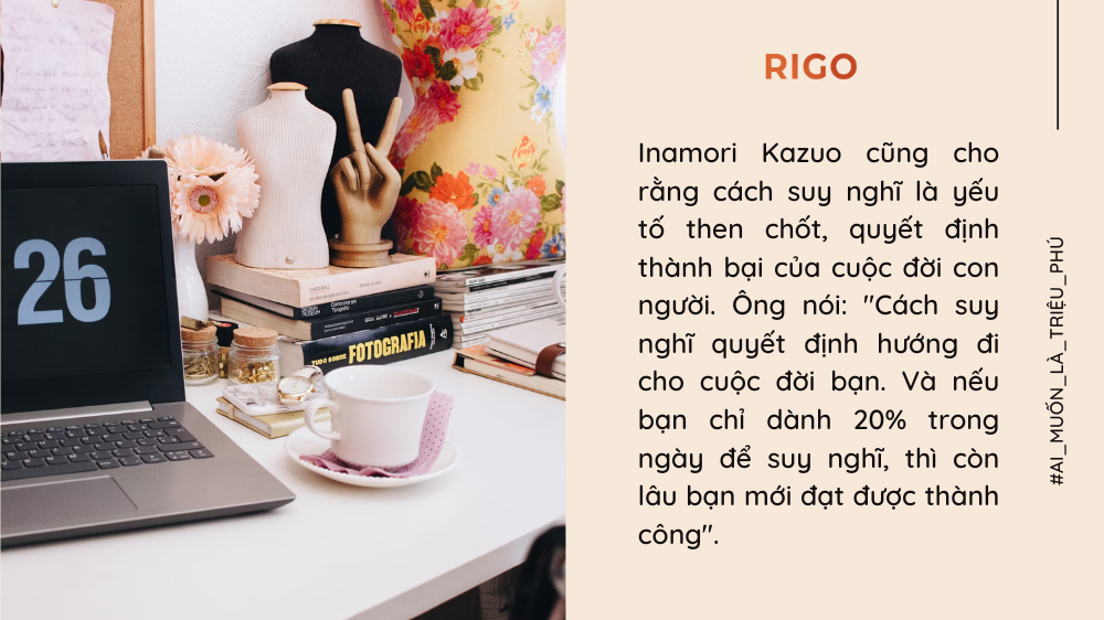 Inamori Kazuo cũng cho rằng cách suy nghĩ là yếu tố then chốt, quyết định thành bại của cuộc đời con người. Ông nói: “Cách suy nghĩ quyết định hướng đi cho cuộc đời bạn. Và nếu bạn chỉ dành 20% trong ngày để suy nghĩ, thì còn lâu bạn mới đạt được thành công”. Triết lý kinh doanh mà cả đời Inamori Kazuo coi trọng đó là tư duy đổi mới. Bởi ông tin rằng chỉ không ngừng học tập, không ngừng đổi mới mới có thể “bất khả chiến bại”, tồn tại và phát triển trong thị trường khắc nghiệt.