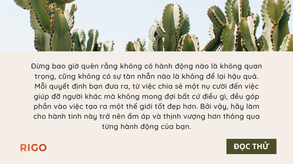 Đừng bao giờ quên rằng không có hành động nào là không quan trọng, cũng không có sự tàn nhẫn nào là không để lại hậu quả. Mỗi quyết định bạn đưa ra, từ việc chia sẻ một nụ cười đến việc giúp đỡ người khác mà không mong đợi bất cứ điều gì, đều góp phần vào việc tạo ra một thế giới tốt đẹp hơn. Bởi vậy, hãy làm cho hành tinh này trở nên ấm áp và thịnh vượng hơn thông qua từng hành động của bạn.