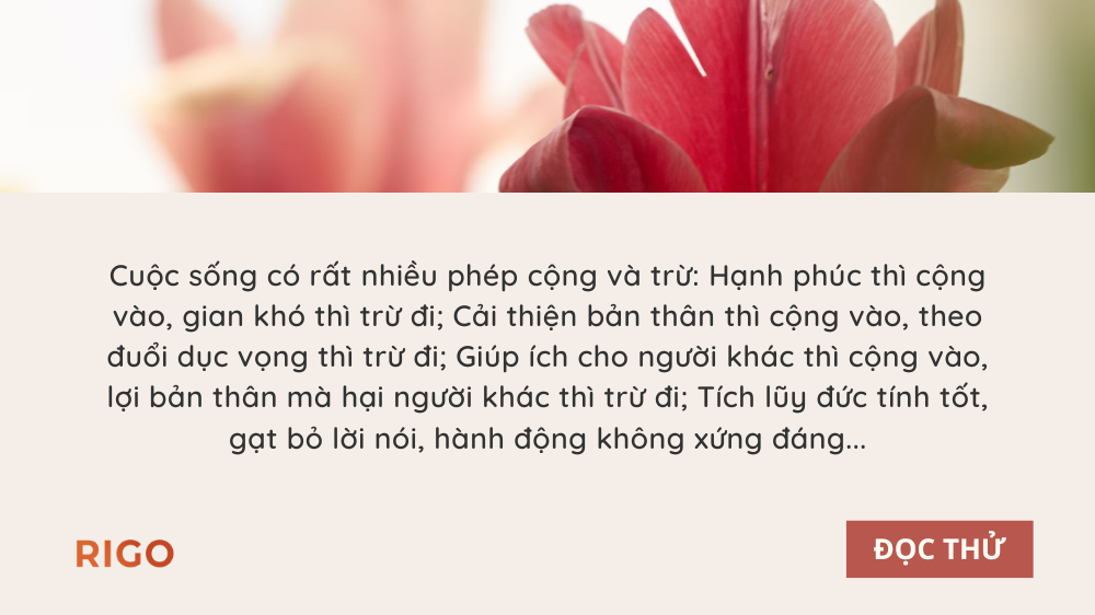 Cuộc sống có rất nhiều phép cộng và trừ: Hạnh phúc thì cộng vào, gian khó thì trừ đi; Cải thiện bản thân thì cộng vào, theo đuổi dục vọng thì trừ đi; Giúp ích cho người khác thì cộng vào, lợi bản thân mà hại người khác thì trừ đi; Tích lũy đức tính tốt, gạt bỏ lời nói, hành động không xứng đáng…