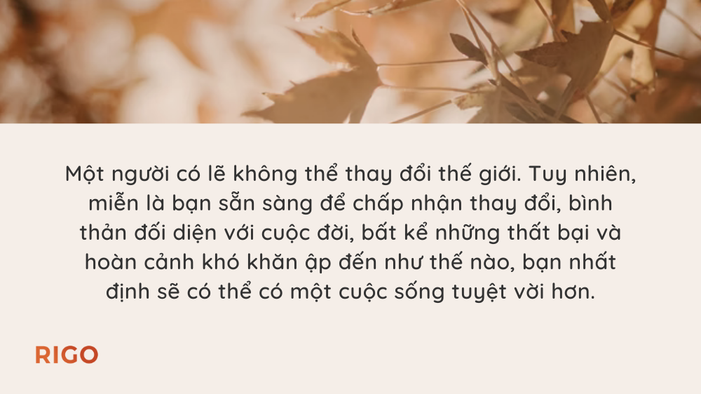 Một người có lẽ không thể thay đổi thế giới. Tuy nhiên, miễn là bạn sẵn sàng để chấp nhận thay đổi, bình thản đối diện với cuộc đời, bất kể những thất bại và hoàn cảnh khó khăn ập đến như thế nào, bạn nhất định sẽ có thể có một cuộc sống tuyệt vời hơn.