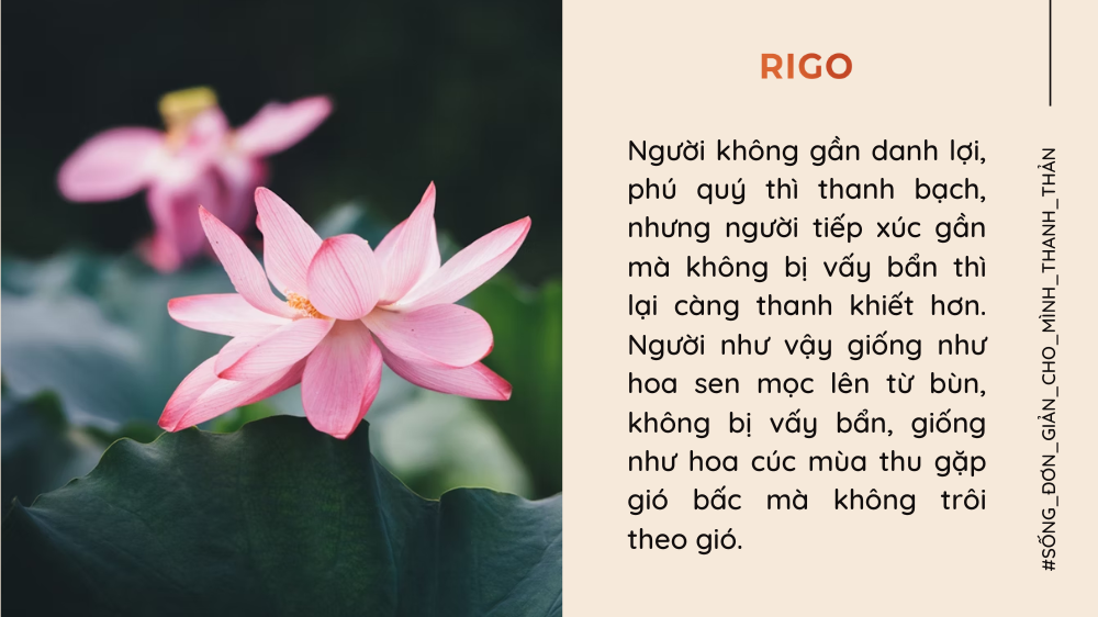 Người như vậy giống như hoa sen mọc lên từ bùn, không bị vấy bẩn, giống như hoa cúc mùa thu gặp gió bấc mà không trôi theo gió. Thế giới dù ồn ào đến đâu cũng không thể làm lung lay sự đơn giản và thuần khiết trong trái tim họ. Giữa thế giới phức tạp này, tôi mong bạn và tôi có thể trở thành một người như vậy.