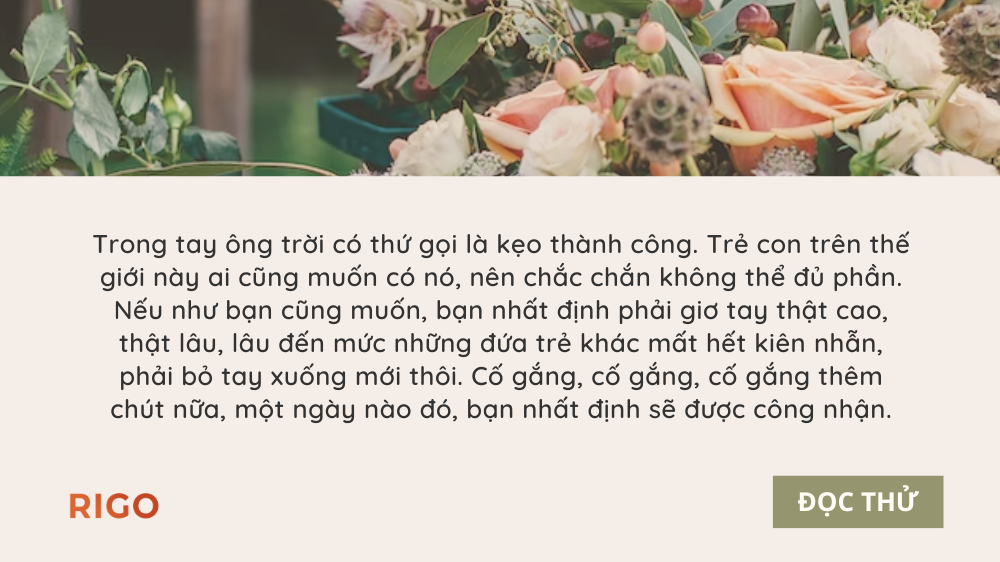 Có câu nói thế này: Trong tay ông trời có thứ gọi là kẹo thành công. Trẻ con trên thế giới này ai cũng muốn có nó, nên chắc chắn không thể đủ phần. Nếu như bạn cũng muốn, bạn nhất định phải giơ tay thật cao, thật lâu, lâu đến mức những đứa trẻ khác mất hết kiên nhẫn, phải bỏ tay xuống mới thôi.