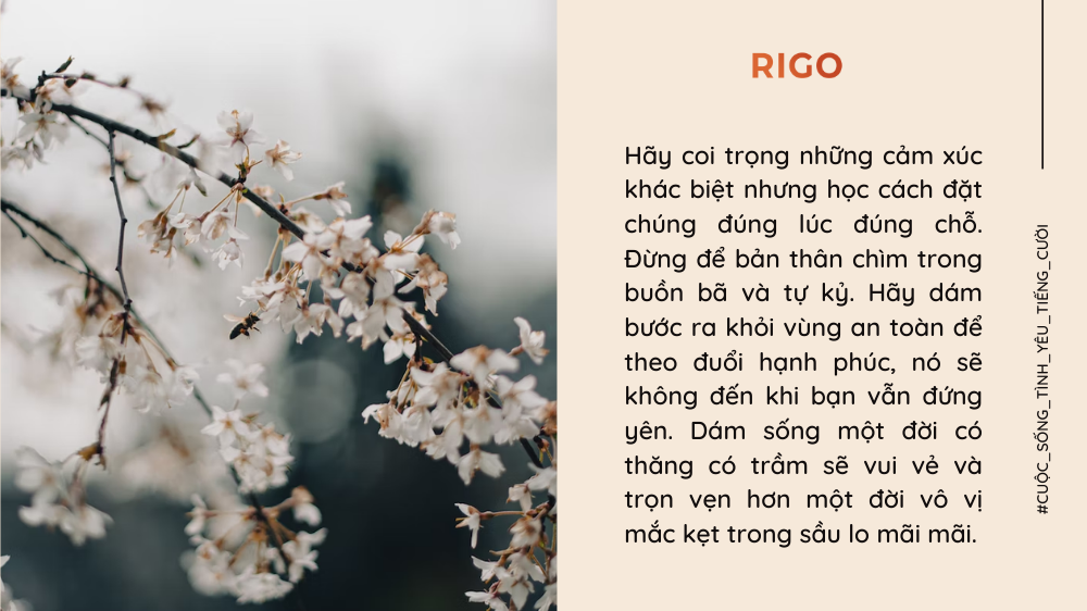 Hãy coi trọng những cảm xúc khác biệt nhưng học cách đặt chúng đúng lúc đúng chỗ. Đừng để bản thân chìm trong buồn bã và tự kỷ. Hãy dám bước ra khỏi vùng an toàn để theo đuổi hạnh phúc, nó sẽ không đến khi bạn vẫn đứng yên.