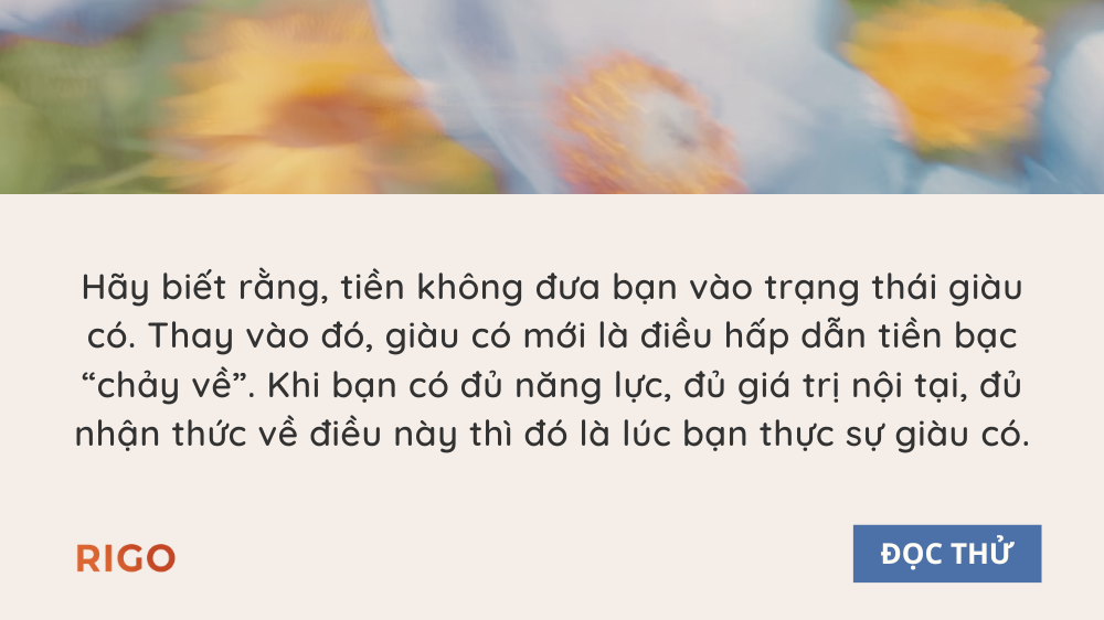 Hãy biết rằng, tiền không đưa bạn vào trạng thái giàu có. Thay vào đó, giàu có mới là điều hấp dẫn tiền bạc “chảy về”. Khi bạn có đủ năng lực, đủ giá trị nội tại, đủ nhận thức về điều này thì đó là lúc bạn thực sự giàu có.