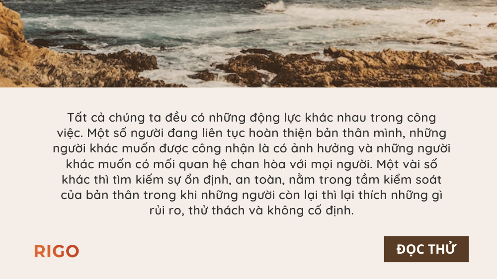 Tất cả chúng ta đều có những động lực khác nhau trong công việc. Một số người đang liên tục hoàn thiện bản thân mình, những người khác muốn được công nhận là có ảnh hưởng và những người khác muốn có mối quan hệ chan hòa với mọi người. Một vài số khác thì tìm kiếm sự ổn định, an toàn, nằm trong tầm kiểm soát của bản thân trong khi những người còn lại thì lại thích những gì rủi ro, thử thách và không cố định.