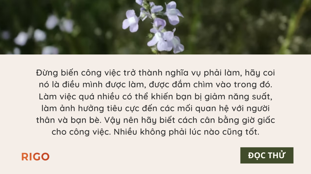 Khi còn sức khỏe, hãy biết trân trọng nó, bạn làm việc quá nhiều cũng là một hình thức tự hủy hoại sức khỏe của mình. Quãng đường còn dài, bạn còn rất nhiều thời gian để làm việc, không nhất thiết phải cố quá làm gì, thậm chí nếu không may sức khỏe bị ảnh hưởng thì lại không thể làm việc nữa.