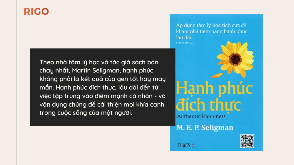 Cuốn sách khởi xướng ngành khoa học mới mang tính cách mạng về Tâm lý học tích cực – và “châm ngòi” cho một cuộc tranh luận xuyên suốt về bản chất của hạnh phúc đích thực. Theo nhà tâm lý học và tác giả sách bán chạy nhất, Martin Seligman, hạnh phúc không phải là kết quả của gen tốt hay may mắn. Hạnh phúc đích thực, lâu dài đến từ việc tập trung vào điểm mạnh cá nhân – và vận dụng chúng để cải thiện mọi khía cạnh trong cuộc sống của một người.