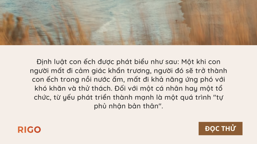 Định luật con ếch được phát biểu như sau: Một khi con người mất đi cảm giác khẩn trương, người đó sẽ trở thành con ếch trong nồi nước ấm, mất đi khả năng ứng phó với khó khăn và thử thách.