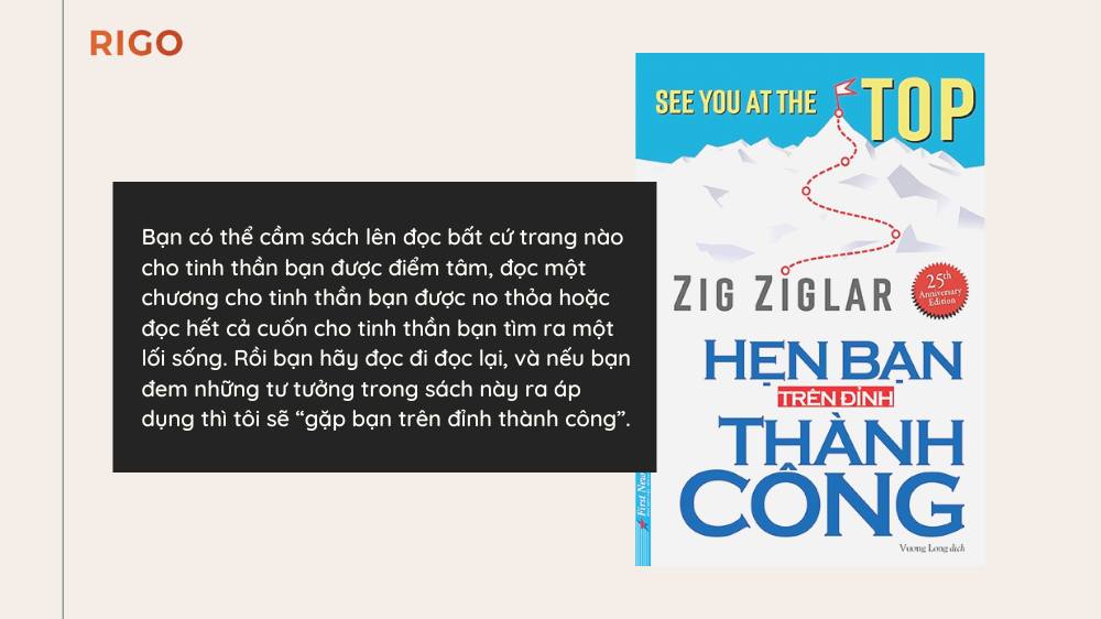 HẸN BẠN TRÊN ĐỈNH THÀNH CÔNG là tác phẩm rất ít lý luận, những tư tưởng, tiến trình và kĩ thuật đều phát sinh từ cuộc sống. Nó kết hợp mật thiết ba mươi năm buôn bán với kinh nghiệm phát triển của loài người, của một cá nhân chịu ảnh hưởng của muôn ngàn chuyên gia lỗi lạc thuộc mọi lãnh vực trên thế giới. Áp dụng tư tưởng và kĩ thuật trong sách là bạn đang học tập kinh nghiệm chứ không phải lý thuyết của người khác.