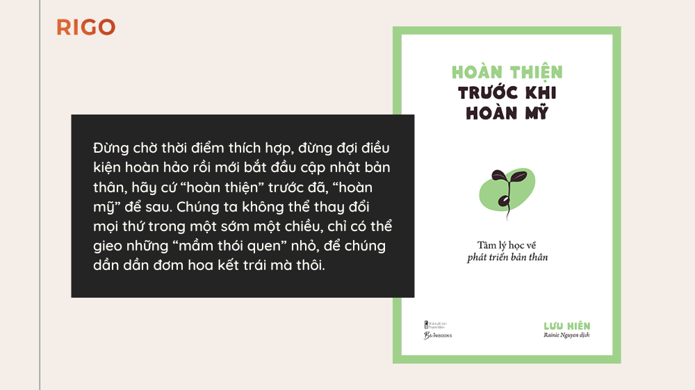 Sau cùng, lời quan trọng nhất mà tác giả Lưu Hiên muốn nhắn gửi tới bạn qua cuốn sách này là: đừng chờ thời điểm thích hợp, đừng đợi điều kiện hoàn hảo rồi mới bắt đầu cập nhật bản thân, hãy cứ “hoàn thiện” trước đã, “hoàn mỹ” để sau. Chúng ta không thể thay đổi mọi thứ trong một sớm một chiều, chỉ có thể gieo những “mầm thói quen” nhỏ, để chúng dần dần đơm hoa kết trái mà thôi.