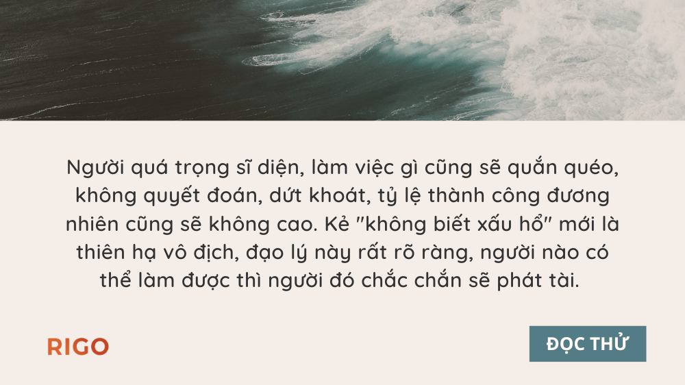 Khi kiếm tiền, chúng ta nên bỏ thể diện xuống, chỉ cần kiên cường là đủ rồi. Người quá trọng sĩ diện, làm việc gì cũng sẽ quắn quéo, không quyết đoán, dứt khoát, tỷ lệ thành công đương nhiên cũng sẽ không cao. Kẻ “không biết xấu hổ” mới là thiên hạ vô địch, đạo lý này rất rõ ràng, người nào có thể làm được thì người đó chắc chắn sẽ phát tài.