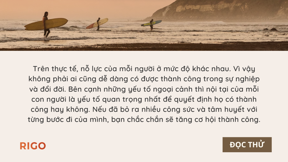 Trên thực tế, nỗ lực của mỗi người ở mức độ khác nhau. Vì vậy không phải ai cũng dễ dàng có được thành công trong sự nghiệp và đổi đời. Bên cạnh những yếu tố ngoại cảnh thì nội tại của mỗi con người là yếu tố quan trọng nhất để quyết định họ có thành công hay không. Nếu đã bỏ ra nhiều công sức và tâm huyết với từng bước đi của mình, bạn chắc chắn sẽ tăng cơ hội thành công.