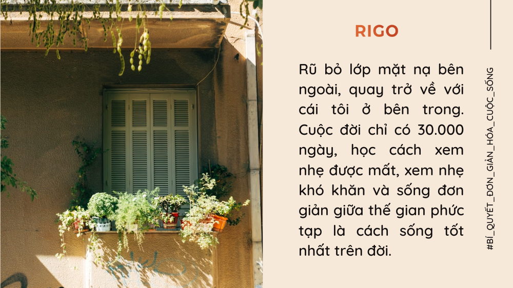 Rũ bỏ lớp mặt nạ bên ngoài, quay trở về với cái tôi ở bên trong. Cuộc đời chỉ có 30.000 ngày, học cách xem nhẹ được mất, xem nhẹ khó khăn và sống đơn giản giữa thế gian phức tạp là cách sống tốt nhất trên đời.