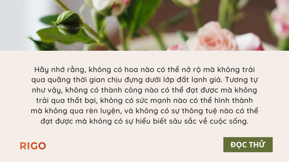Hãy nhớ rằng, không có hoa nào có thể nở rộ mà không trải qua quãng thời gian chịu đựng dưới lớp đất lạnh giá. Tương tự như vậy, không có thành công nào có thể đạt được mà không trải qua thất bại, không có sức mạnh nào có thể hình thành mà không qua rèn luyện, và không có sự thông tuệ nào có thể đạt được mà không có sự hiểu biết sâu sắc về cuộc sống. Bằng cách thay thế sự tiêu cực bằng những câu hỏi mang tính xây dựng, chúng ta không chỉ học cách đối mặt và vượt qua khó khăn mà còn biến những khó khăn đó thành bàn đạp để tiến xa hơn, cao hơn trong hành trình phát triển bản thân. Cuộc sống rất dài nếu bạn phóng to dòng thời gian. Bạn sẽ thấy rằng sát thương bạn nhận được bây giờ là một kinh nghiệm, một sự chuẩn bị cho việc vượt qua các cấp độ và chiến đấu với nhiều thách thức khác nhau trong tương lai.