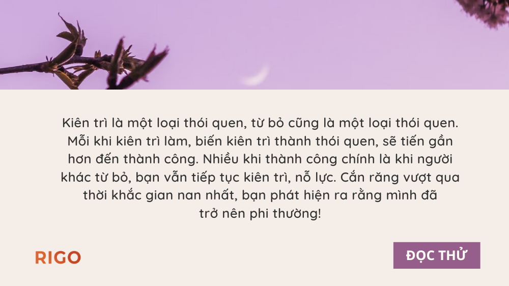 Kiên trì là một loại thói quen, từ bỏ cũng là một loại thói quen. Mỗi khi kiên trì làm, biến kiên trì thành thói quen, sẽ tiến gần hơn đến thành công.
