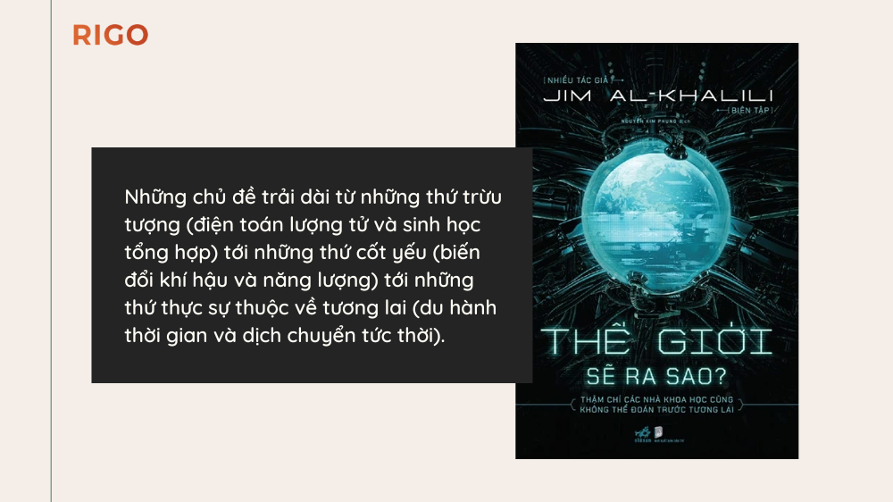 Trong Thế giới rồi sẽ ra sao? 18 nhà khoa học và chuyên gia sẽ khám phá những gì đang chuẩn bị xảy đến với nhân loại. Những chủ đề của họ trải dài từ những thứ trừu tượng (điện toán lượng tử và sinh học tổng hợp) tới những thứ cốt yếu (biến đổi khí hậu và năng lượng) tới những thứ thực sự thuộc về tương lai (du hành thời gian và dịch chuyển tức thời). Và cùng với đó, họ sẽ chỉ cho chúng ta thấy làm thế nào để tái cấu trúc xã hội sau tận thế, và một quả trứng rùa ốp lết sẽ dạy cho chúng ta những gì về việc cứu lấy hành tinh này.