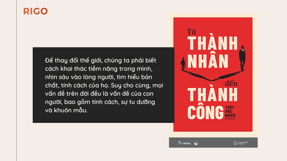 Lý giải sâu hơn về điều này, tác giả Thuỷ Mộc Nhiên trong “Từ Thành Nhân Đến Thành Công” đã thể hiện quan điểm cụ thể rằng: Để thay đổi thế giới, chúng ta phải biết cách khai thác tiềm năng trong mình, nhìn sâu vào lòng người, tìm hiểu bản chất, tính cách của họ. Suy cho cùng, mọi vấn đề trên đời đều là vấn đề của con người, bao gồm tính cách, sự tu dưỡng và khuôn mẫu.