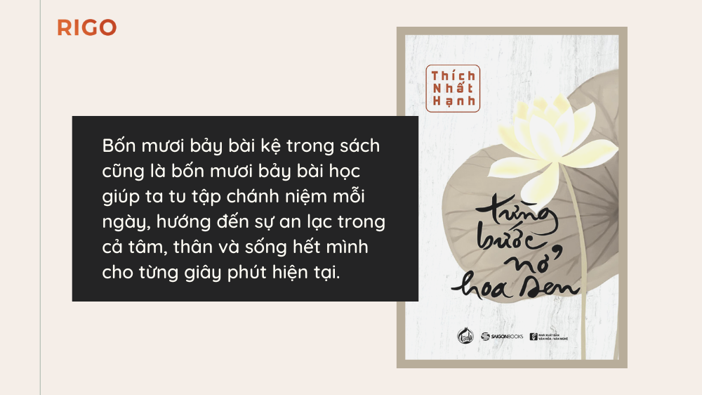 Từng bước nở hoa sen của Thiền sư Thích Nhất Hạnh là một trong những quyển sách “dạy” ta cách sống an nhiên như thế. Bốn mươi bảy bài kệ trong sách cũng là bốn mươi bảy bài học giúp ta tu tập chánh niệm mỗi ngày, hướng đến sự an lạc trong cả tâm, thân và sống hết mình cho từng giây phút hiện tại.