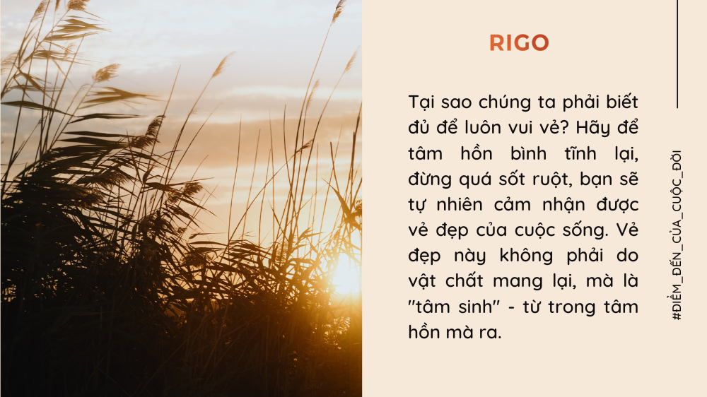 Tại sao chúng ta phải biết đủ để luôn vui vẻ? Hãy để tâm hồn bình tĩnh lại, đừng quá sốt ruột, bạn sẽ tự nhiên cảm nhận được vẻ đẹp của cuộc sống. Vẻ đẹp này không phải do vật chất mang lại, mà là “tâm sinh” – từ trong tâm hồn mà ra.