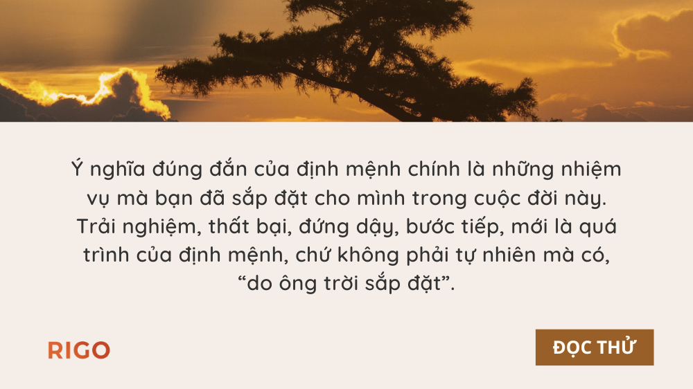 Những trở ngại mà mỗi người phải đối mặt trong cuộc đời đều là bài học do chính mình sắp đặt từ bẩm sinh, có thể gọi là “định mệnh”. Ý nghĩa đúng đắn của định mệnh chính là những nhiệm vụ mà bạn đã sắp đặt cho mình trong cuộc đời này. Trải nghiệm, thất bại, đứng dậy, bước tiếp, mới là quá trình của định mệnh, chứ không phải tự nhiên mà có, “do ông trời sắp đặt”.