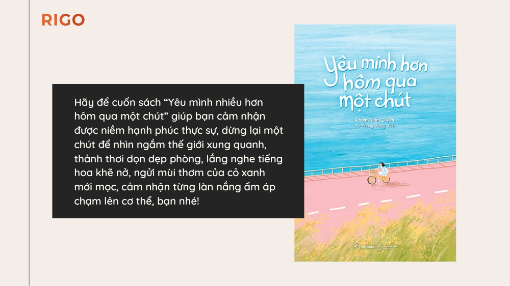 Vậy thì hãy để cuốn sách “Yêu mình nhiều hơn hôm qua một chút” giúp bạn cảm nhận được niềm hạnh phúc thực sự, dừng lại một chút để nhìn ngắm thế giới xung quanh, thảnh thơi dọn dẹp phòng, lắng nghe tiếng hoa khẽ nở, ngửi mùi thơm của cỏ xanh mới mọc, cảm nhận từng làn nắng ấm áp chạm lên cơ thể, bạn nhé!
