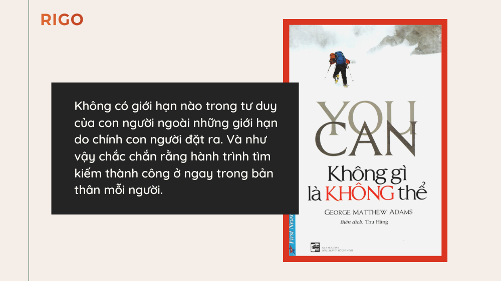 Không gì là không thể của George Matthew Adams đã dần trở thành người bạn đồng hành thân thiết của rất nhiều người. Những triết lý đơn giản nhưng vô cùng sâu sắc và hữu dụng trong cuốn sách đã giúp rất nhiều người đạt được thành công như họ mong đợi. Đến với những bí quyết này, bạn sẽ nhận ra rằng: Không có giới hạn nào trong tư duy của con người ngoài những giới hạn do chính con người đặt ra. Và như vậy chắc chắn rằng hành trình tìm kiếm thành công ở ngay trong bản thân mỗi người.
